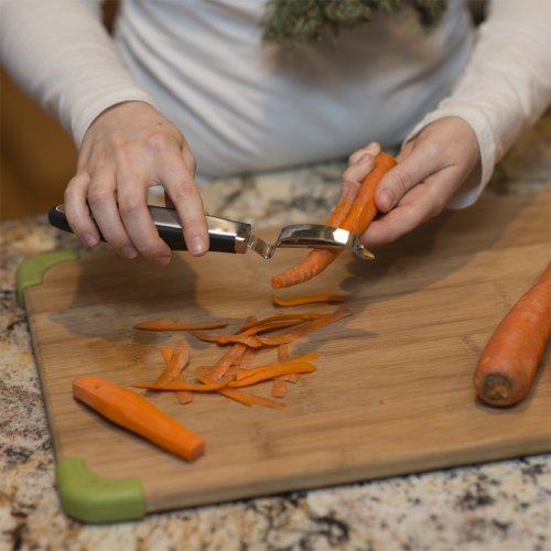 - Feature : OVERSIZE ERGONOMIC RUBBER HANDLE - Easy-to-hold ergonomic rubber handle with stainless steel accents lets you work easier and faster with less fatigue. / SWIVELING BI-DIRECTIONAL DUAL BLADES - The durable stainless steel blade has dual cutting edges for easy cutting in either direction. / FLEXIBLE CURVED BLADE SUPPORT - The flexible stainless steel blade support allows the blade to move and effortlessly glide over your vegetables, and also incorporates a tip designed for removing sprouts or bruised areas. / EASY-TO-CLEAN DISHWASHER-SAFE - The durable stainless steel and rubber construction of your peeler makes for easy cleanup and a lifetime of use. / LIFETIME GUARANTEE - If you're not happy we're not happy! If we can't make it right and you are not satisfied for any reason, we will gladly and promptly refund your purchase price. We promise!