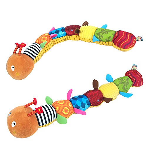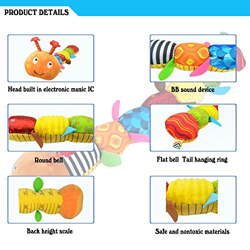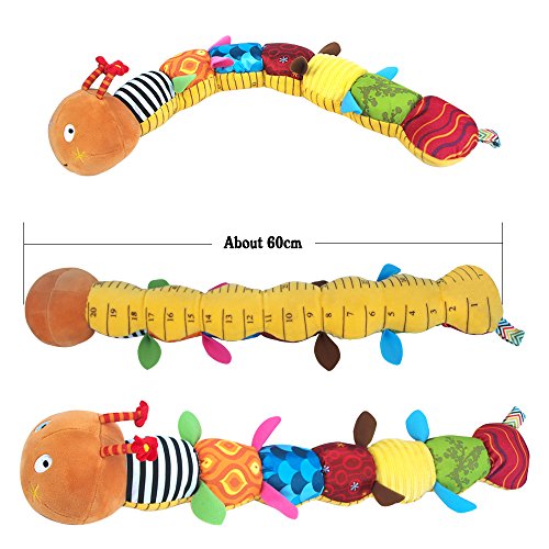 -. Feature : ★ Musical Caterpillar: Squeeze the head to hear a lovely song. Musical sound, can attract the baby to play as well as feel the embrace and the response of the interaction. / ★ Visual Development: The caterpillar toy dissolves into the variety of colors and patterns of a gorgeous, can promote children's visual development. / ★ Ruler Function: The tummy is equipped with both meter and foot scale, intimate design for Mommy Baby record at any time. The baby is very soft, there is no way to record height by standing, so just put the baby flat on the bed, you can use this to record a height, the maximum size is 60cm. Never mind if the baby is higher than the scale, measure twice is ok. / ★ Ring Bell: Except the head, other sections are built with beautifully clear bells, BB and ring paper layer, a pinch of BB will send BB's voice, loud rustling of paper pressure, more functions is made for smart baby to find out. / ★ Healthy Growth for Baby: These functions will be able to fully attract the attention of the baby, enhance the strength of hand and wrist activities, and promote the development of hand muscles and stimulate the baby's visual, auditory development.