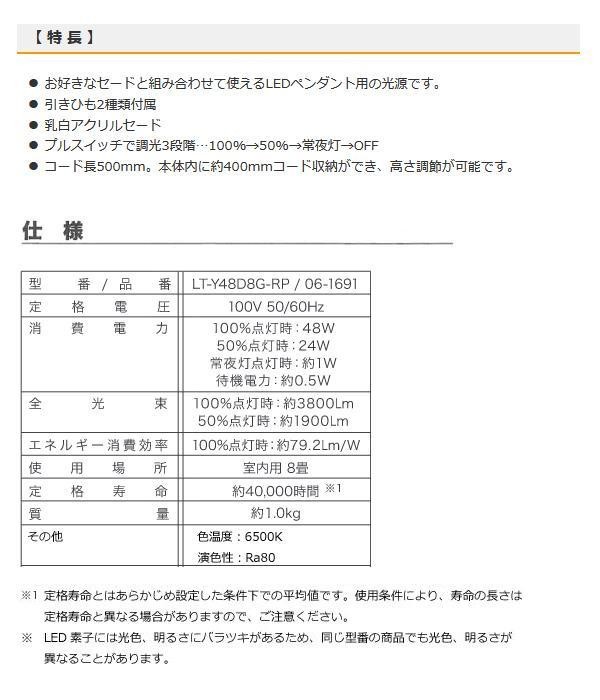プルスイッチ式3段階調光機能付きのLEDペンダント用の光源です。お好みのセードと組み合わせてお使いいただけます。 製造国:中国 付属品:引きひも2種類取扱説明書兼保証書(保証期間:1年間) ※サプライヤー直送品 ご注文後2~3営業日後の出荷となります【商品名】オーム電機 OHM LEDペンダント用光源 8畳用 昼光色 LT-Y48D8G-RP