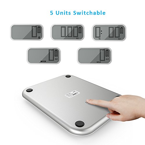- [UNIT EXCHANGE]: Measures in grams, lb, oz, water-ml and milk-ml. Press the unit key to choose the unit, which is on the back of the scale.Please set the unit before weighing.It could not change the unit while weighing.