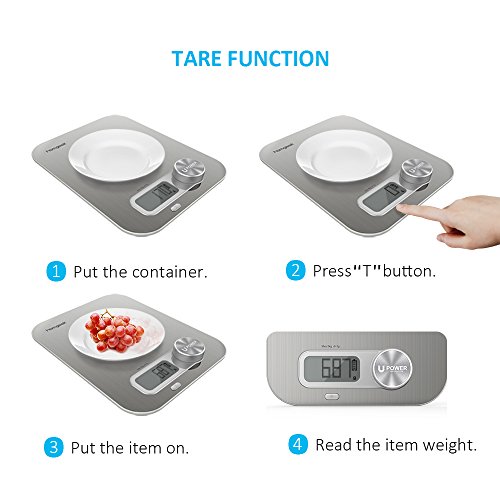 - [TARE FUNCTION]: A precise TARE function can reset the current weight on the scales to zero, so that you can weigh foods directly. Just put the container on the platform, the LCD will show the weight of container, then press “tare” and put the food, you will get the weight of the food.