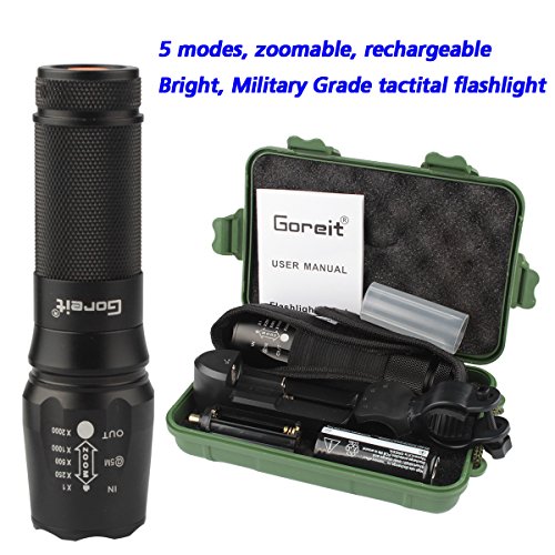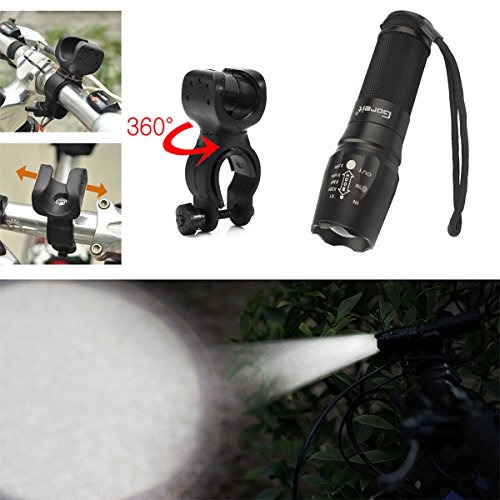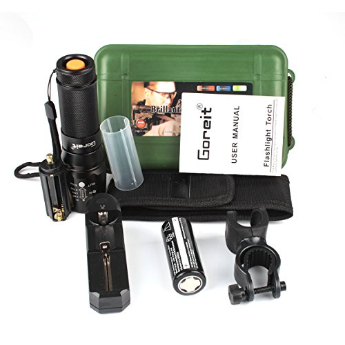 Goreit G700 900 Lumens T6 LED Military Flashlight, waterproof zoom Focus Handheld, 5 modes, with 26650 battery and charger, 360°bicycle mount, for biking Hiking, Camping, Emergency etc