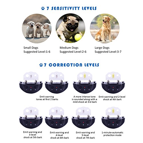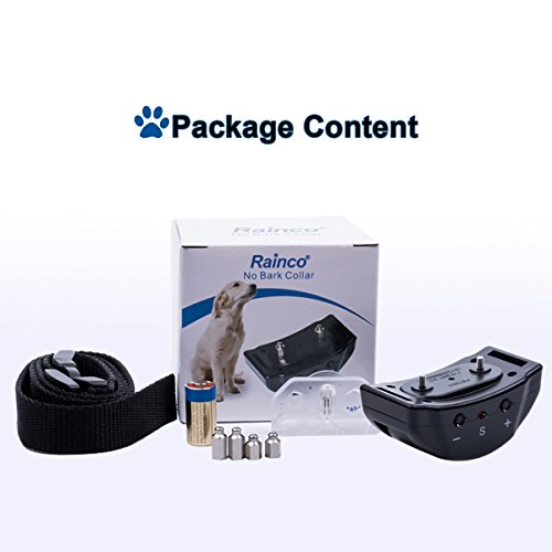 Good new for dog owner: Too much Barking? Too much argument of your dogs. Rainco Presents you the upgraded Anti-Barking Collar for you dogs. This collar helps you to control your dogs from barking in a very safe and harmless way. Rainco Anti-Barking Collar gives you peaceful and happy environment for you, your families and neighbors. Product Features: 1. Sound Shock mode training your dog 2. The option have sound warning prior to the stimulation Modes to ensure your dog learns to stop barking 3. Suitable for Small / Medium / Large Dogs and Recommended for dogs from 10 to 120 pound dogs 4. The 75CM Collar is Adjustable Length from 5.9" (15cm) to 22" (56cm) 5. Sound Mode warning prior to the stimulation 6. 7 levels sensitivity adjustable for different dogs and environments 7. Easy testing method to check the Electric Shock Collar 8. The Dog Training Collar will into 1-minute Auto protection mode after 7 times consecutive working (pause time must be less than 30s) 9. Material: ABS Hardware What's in the box: 1 x No Bark Collar with PP Collar 1 x 2 Set Metal Probes (Long / Short) 1 x 6V Battery 1 x Test Light Bulbs 1 x English Manual 0