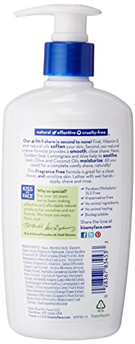 -. Binding : Health and Beauty -. Brand : Kiss My Face -. Label : Kiss My Face -. Manufacturer : Kiss My Face -. ProductGroup : Health and Beauty -. ProductTypeName : HEALTH_PERSONAL_CARE -. Publisher : Kiss My Face -. Studio : Kiss My Face -. Title : Kiss My Face 4-in-1 Moisture Shave Fragrance Free 11oz Pump