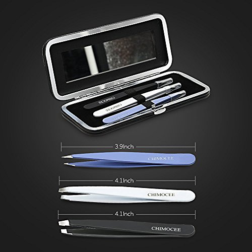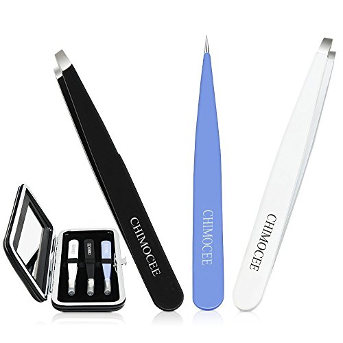 Chimocee Eyebrow Tweezer Set, 3PS Premium Stainless Steel Eyebrow Slant Tip Tweezers with Leather Case and Mirror, Best Precision Eyebrow, Hair Remover, Splinter Ingrown and Tick Removal Tweezers