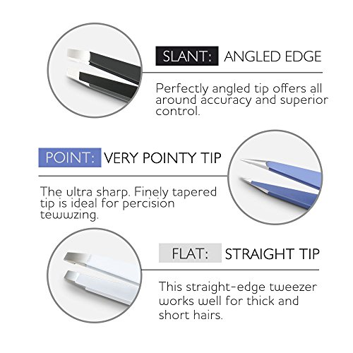 - THREE DIFFERENT PROFESSIONAL PRECISION TWEEZER: A great tool with special crafting and high precision. The flat tip works for thick and short hairs. The pointed tip is precise enough for ingrown and hard-to-reach hairs (and splinters). The slanted-point tip features both a slant and pointed tip in one for precision and pressure.
