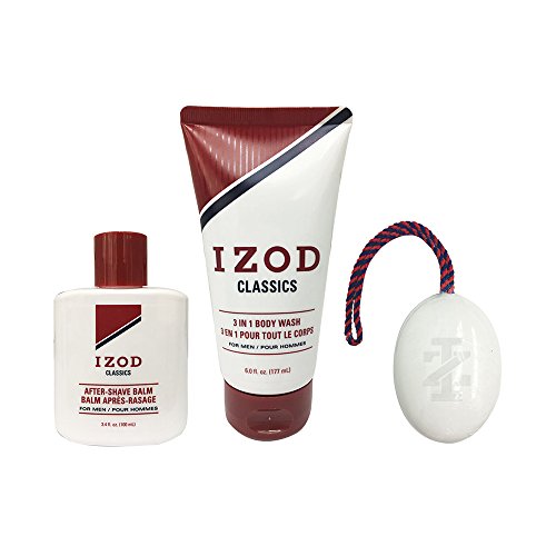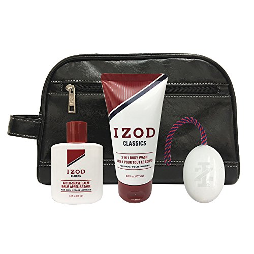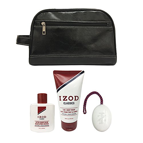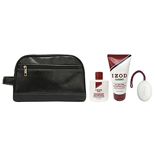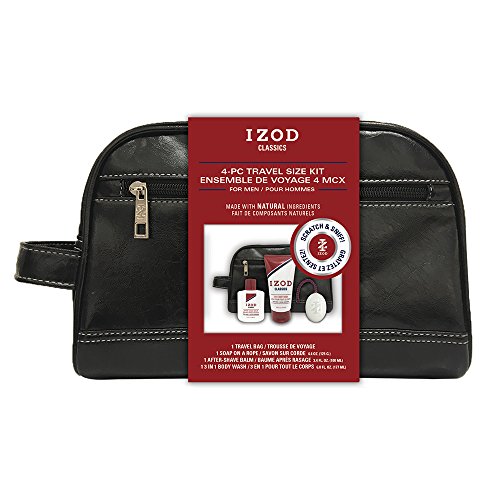 Izod Mens 4-Piece Travel Size Toiletry Kit with Faux Letter Travel Bag, Soap on a Rope, After-Shave Balm and Body Wash