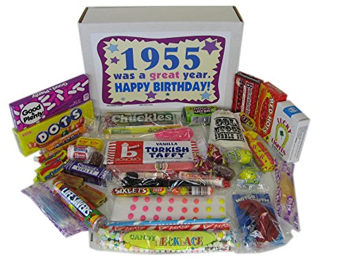 -. Binding : Misc. -. Brand : Woodstock Candy -. Feature : Contains thirty kinds of retro nostalgic candy / 1955 birthday gift box filled with nostalgic candy is sure to bring back memories to a baby boomer / Makes a fun and unique birthday gift for someone who is celebrating their 62nd birthday / Everyone loves candy from their childhood / Box measures 9.5 x 7 x 3 inches and comes shrink wrapped -. IsAdultProduct : 0 -. Label : Woodstock Candy -. Manufacturer : Woodstock Candy -. PackageQuantity : 1 -. ProductGroup : Grocery -. ProductTypeName : GROCERY -. Publisher : Woodstock Candy -. Studio : Woodstock Candy -. Title : 62nd Birthday Gift Box of Nostalgic Retro Candy for a 62 Year Old Man or Woman Born in 1955 - Decade 50s Jr