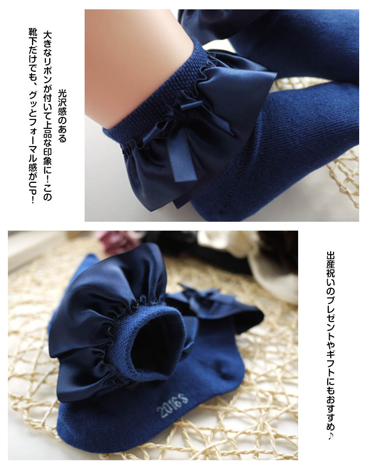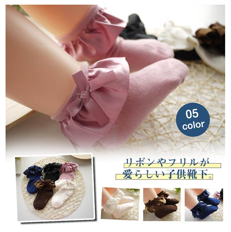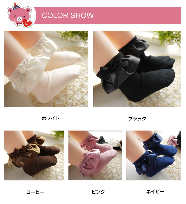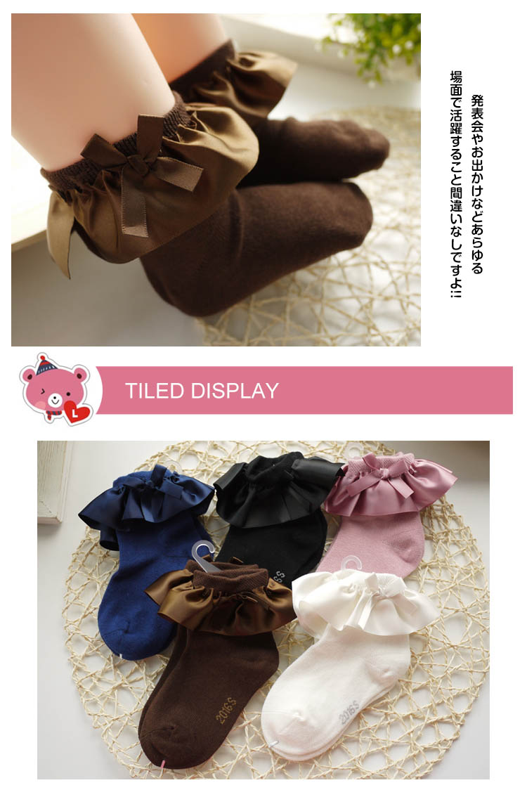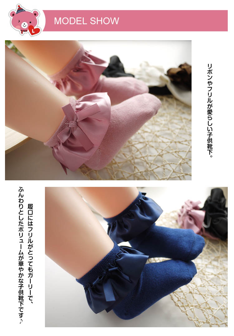 | リボンやフリルが愛らしい子供靴下。履口にはフリルがとってもガーリーで、ふんわりとしたボリュームが華やかな子供靴下です♪発表会やお出かけなどあらゆる場面で活躍すること間違いなしですよ!! | |