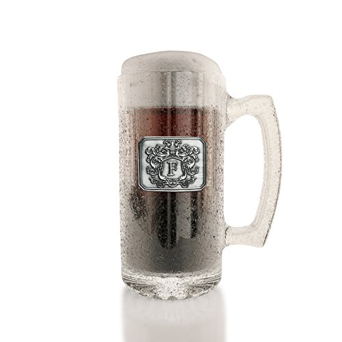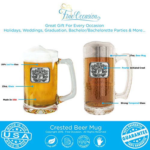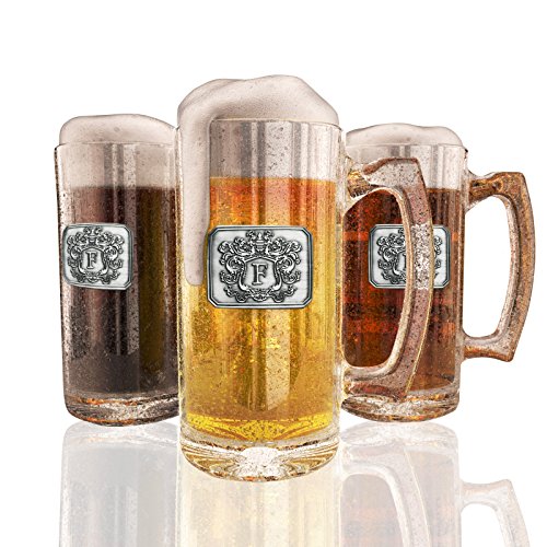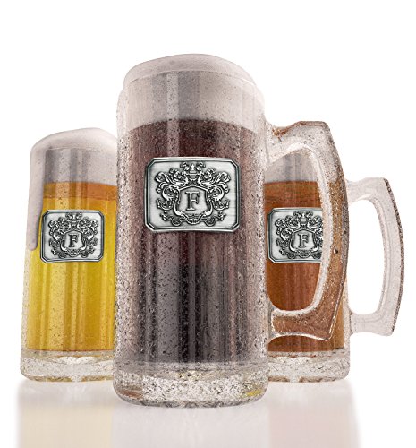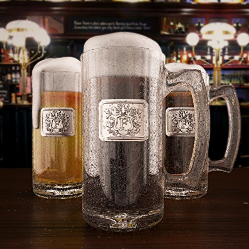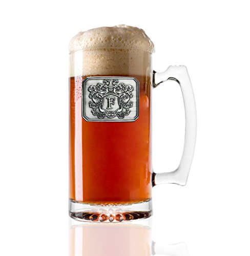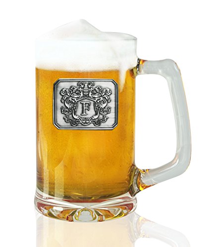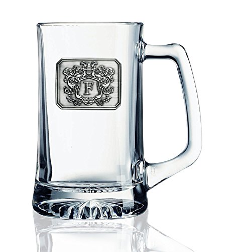 Fine Occasion Glass Beer Stein Mug Monogram Initial Pewter Engraved Crest with Letter F, 27 oz