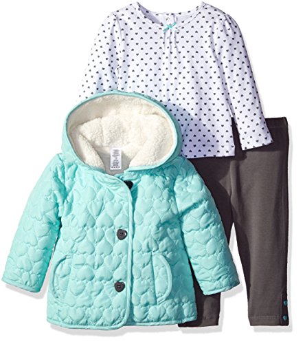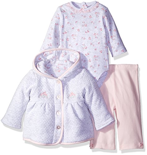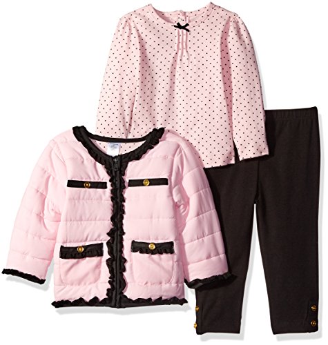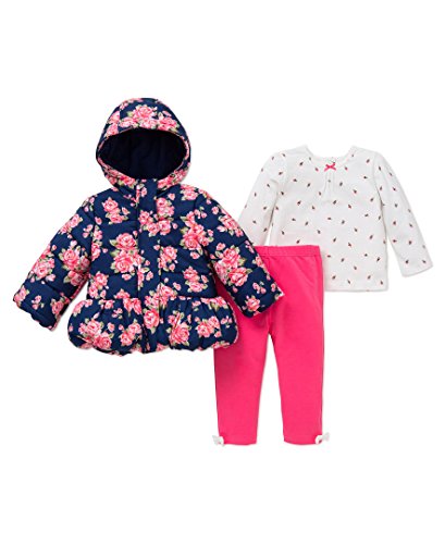 This adorable 2 and 3 piece set makes getting your newborn/infant baby girl ready for the day easy and fun. Newborn includes a snap front reversible hooded jacket and pull on knit pants. Infant includes a jacket, long sleeve knit tee and pull on knit pant.Feature