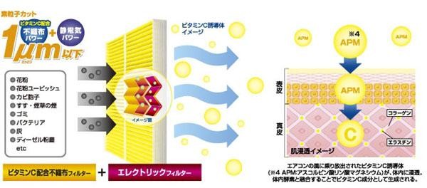 | エアコンフィルター。フィルターに添着されたビタミンセラミックと大気中の水分が融合してビタミンC誘導体として空気中に放出します。エレクトリックフィルターで車外からの花粉、車内に浮遊するホコリ、カビ、バクテリア、ディーゼル粉塵など、1ミクロン以下の微粒子もカット!ビタミンC配合不織布フィルター+エレクトリックフィルターのツインパワーで強力濾過性能を長時間持続。取付け簡単!新車からの交換もオススメ! |