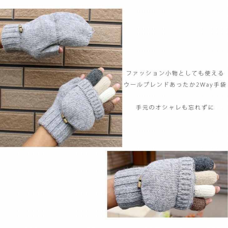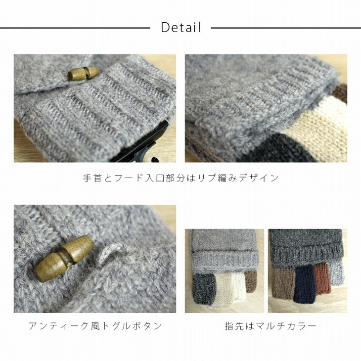 【商品仕様】・指なし+フードを被せてミトンとしても着用可能・ウールブレンドであったか【商品説明】・指先を使う作業(スマホ操作など)にも使えるあったか手袋・ワンタッチでミトンにもなる、便利な2Way・カラバリ2色・オシャレなマルチカラーでコーデのスパイスに・アンティーク風トグルボタン・男女兼用【サイズ】全長(指先から手首まで) : 約21~21.5cmミトンカバーを被せた時の全長 : 約24~24.5cm※縫製の具合により、若干の誤差がございます【 発送について 】ご入金確認後1~3営業日以内に「ゆうメール」もしくは「ヤマトメール便」でお送り致します。※日曜・祝日の発送は行っておりません。発送後2~5日営業日で商品到着予定となります