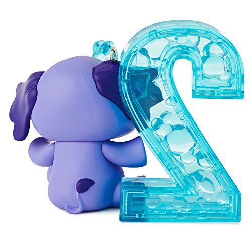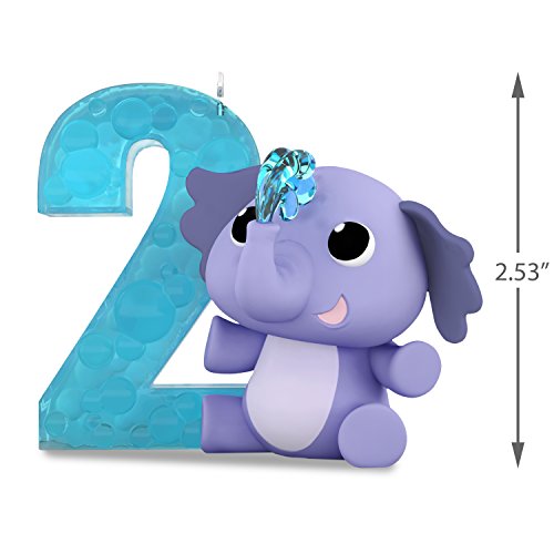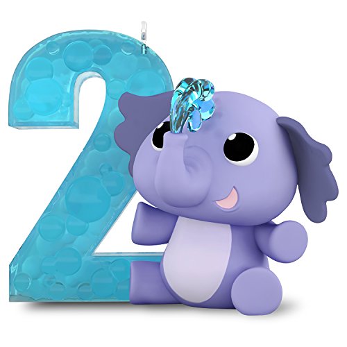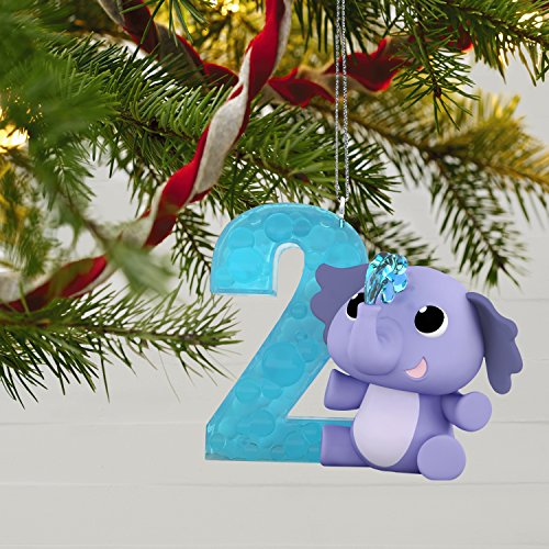 Commemorate your child's 2nd year of trying out fun, new things with this milestone Christmas tree ornament. Set in front of a bubble-filled number 2, a purple baby elephant blows water from its trunk.
