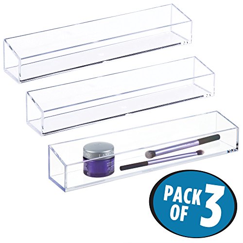 mDesign Bathroom Organizer Tray for Cosmetics, Nail Polish, Makeup Brushes - Pack of 3, 12" x 2.4" x 2", Clear