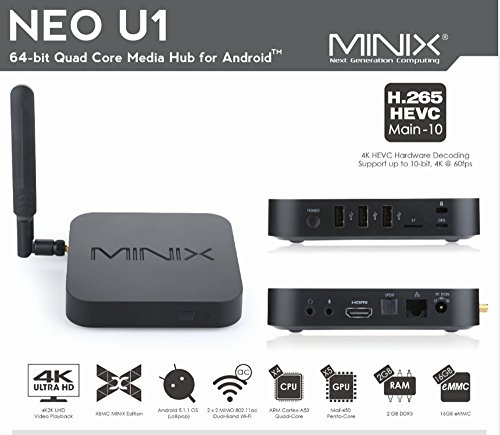 -. Feature : Minix Neo U1, Amazing Ultra HD Streaming Media Hub. NEO U1 is the ultimate home entertainment media hub, designed to bring a world of online entertainment to your living room; including web browsing, stunning Ultra High-Definition video playback and real-time streaming, access to popular media player apps such as KODI, screen-casting capability, local media playback capability via USB port, Internet radio and audio streaming services, Skype along with other VoIP services / Minix NEO U1 Android tv box with Ultra-Connectivity. NEO U1 showcases the latest wireless advancements with the inclusion of 802.11ac 2 x 2 MIMO Dual-Band Wi-Fi (2.4GHz/5.0GHz), combining both an internal and external antenna to accomplish lightning-fast, flawless streaming. NEO U1 also features Gigabit Ethernet for those who prefer a wired connection. / Stunning Cinematic Experience NEO U1 is built for the video purists, delivering an incredibly rich and intense cinematic experience. It is our first Media Hub for Android to support video output up to 4K @ 60Hz, pioneering cutting-edge technologies to achieve ultra-sharp 4K imagery and enhanced media playback quality. / Vivid 10-bit Colour NEO U1 supports up to 10-bit colour format, significantly increasing the dynamic range of colors displayed, adding new depths and vibrant picture quality not found on previous Media Hubs for AndroidTM. / Ultra-Responsive NEO U1 offers improved application performance and responsiveness thanks to running Android Lollipop 5.1.1 OS. While MINIX's exclusive launcher presents a clean, well-designed and accessible interface that makes finding what you want easier than ever. Our F.O.T.A (Firmware-Over-The-Air) Update System means all updates will be available to download and install automatically onto your NEO U1.