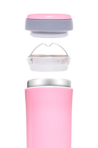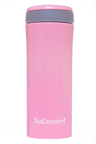 -. Brand : TeaDream -. Color : Pink -. EAN : 0715202229646 -. Feature : Double wall vacuum insulation keeps beverages hot or cold for up to 8 hours. / Made of high quality stainless steel that is durable and dishwasher safe. / Removable tea infuser makes it easy to brew a cup of your favorite loose leaf tea, keeping tea leaves out of your drink. / Comes with a convenient dry tea storage compartment on top, so you don't have to carry your loose leaf tea in a separate container. / Beautiful sleek design makes it easy to carry the bottle in your hand or to fit it in a cup holder of your car. -. PackageQuantity : 1 -. ProductGroup : Kitchen -. ProductTypeName : KITCHEN -. Size : 12 oz -. Title : TeaDream Travel Mug (Tumbler) with Tea Strainer, Stainless Steel, 12 oz -. UPC : 715202229646