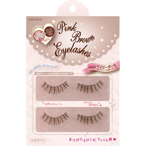 大人かわいい『すっぴん風』つけまつげです。かわいくなれる魔法の色『ピンクブラウン』がつけまつげに。ピンクブラウン毛50%とダークブラウン毛50%をMIXした特別な色だから自然になじんでほどよいパッチリ目に。とろけるように甘い、ピュアな目元を作り上げます。やわらかな透明軸だからやさしいつけ心地でまぶたにしっかりフィット。汗や水につよい密着接着剤つき。つけかたの説明書つきだから初心者にもつかいやすい。【ベイビーガール】全体ボリューム&中央が長めのまる目タイプ。甘くキュートなガーリーeyeを演出。Feature