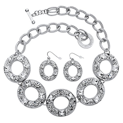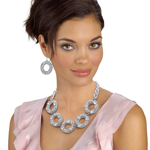This notice-me jewelry set lavishes your neckline with crystal encrusted circles for the latest gotta-have-it look. Includes 18" length necklace and drop earrings. Silvertone. - 54553