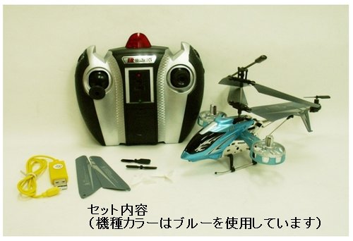 セット内容:本体、コントローラー、スペアメインローター上下各1枚の計2枚、スペアテールローター1枚、サイドローター1枚、USBコード、ドライバー、説明書