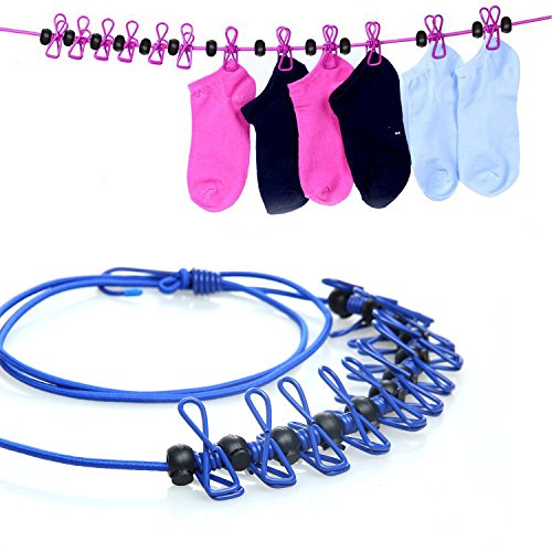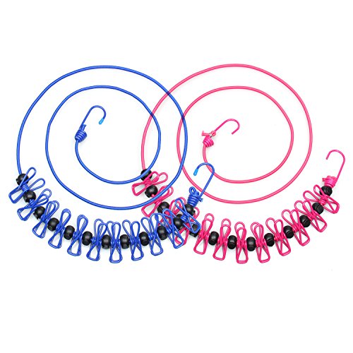 Portable Clothesline 2 Pack Swify Outdoor Retractable Clothesline Elastic Clothes Line with Clips for Travel Hotel Camping Hiking Using(Blue + Rose)