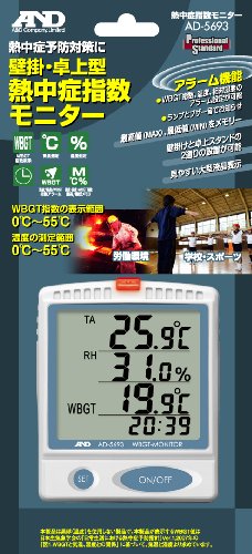 "a & D wall-mounted desk-top heatstroke index monitor AD-5693" is a school and gymnasium heatstroke index monitor of easy-to-read large display to help safety management of the work environment. WBGT index air temperature relative humidity the time simultaneous display. Memory the best value and the lowest value. WBGT index temperature alarm can be set of relative humidity. We will inform the alarm buzzer sounds and the LED lamp. A wide temperature measurement range of (0-55 degrees) the display range (0-55 degrees) of the WBGT index. It is possible the installation of two types of wall-mounted and tabletop stand. The attention WBGT is the index to evaluate the heat stress experienced by the people in a hot environment including heat stroke. (Wet Bulb Globe Temperature) Product Specifications ● display item: WBGT index air temperature relative humidity time