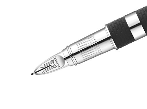 -. Feature : Brand PARKER Product Number S11201732 Color Black Material food; polished stainless steel, clip / trim; finish shiny chrome plate, body; weave pattern brass sculpture soft-touch black lacquer finish + chrome ring / cap; brass soft-touch black lacquer finish Line type fine print Ink color black Pen of the fifth type of pen