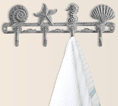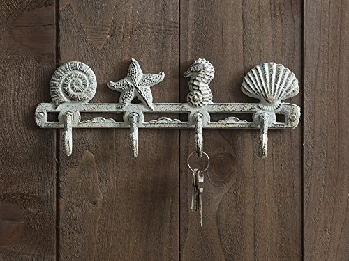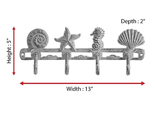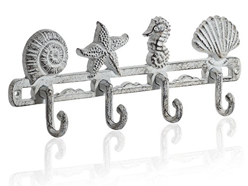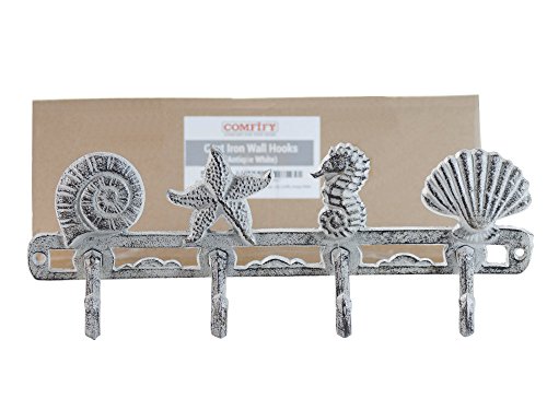 Vintage Seashell Coat Hook Hanger by Comfify | Rustic Cast Iron Wall Hanger w/ 4 Decorative Hooks | Includes Screws and Anchors | in Antique White | (Seashell Wall Hanger CA-1507-03)