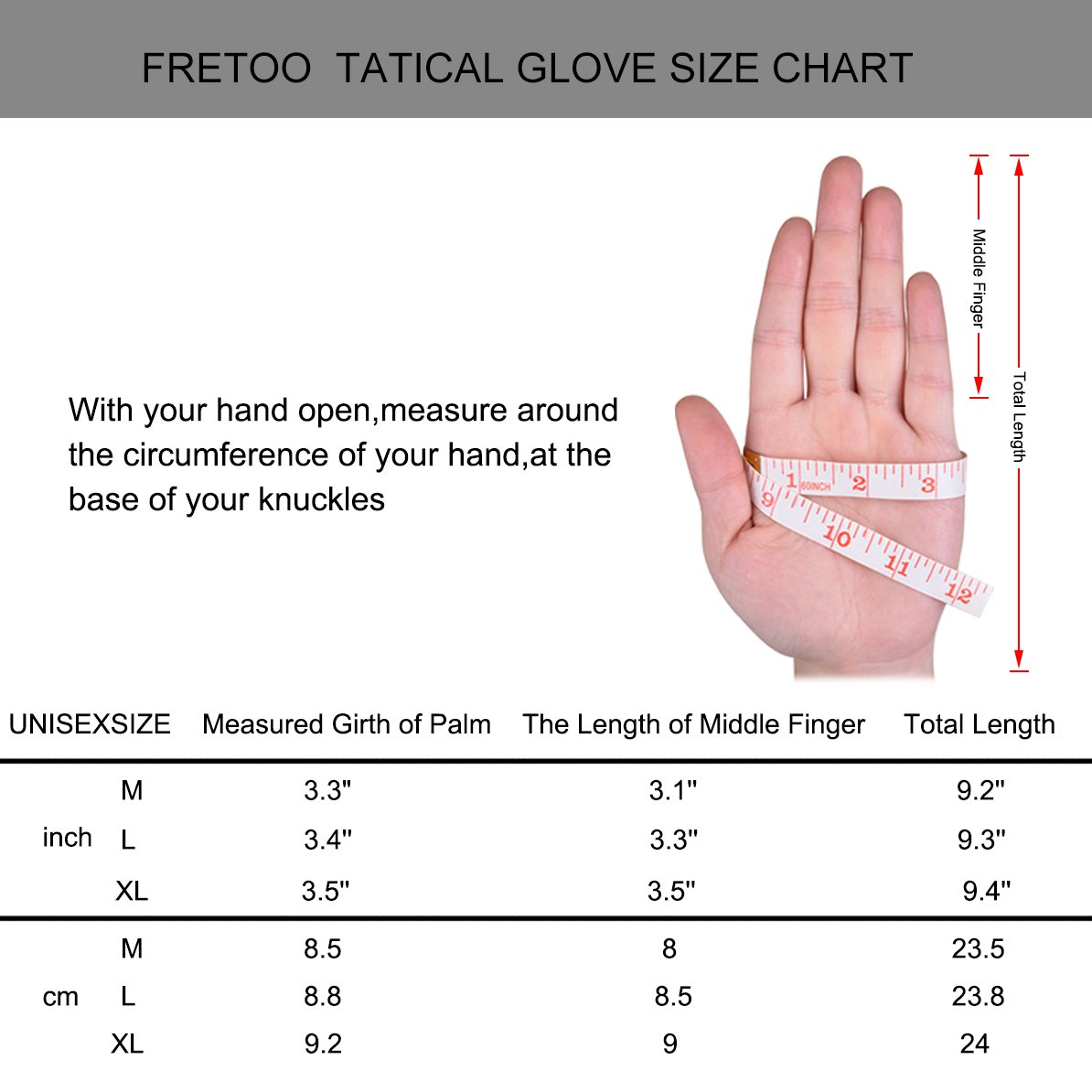 L Overall Length 9.3 "/ 23.8 cm, Width 3.4" / 8.8 cm, Length of middle finger 3.3 "/ 8.5 cm