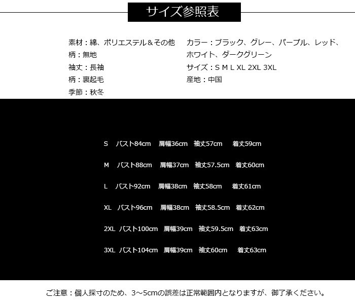 セーター レディース ニットセーター ニットトップス 長袖 裏起毛 無地 トップス カジュアル ファション 着痩せ 2018秋冬新作 ニットセーター レディース 長袖 トップス 裏起毛商品詳細素材:綿、ポリエステル&その他柄:無地袖丈:長袖柄:裏起毛季節:秋冬カラー:ブラック、グレー、パープル、レッド、ホワイト、ダークグリーンサイズ:S M L XL 2XL 3XL産地:中国サイズ参照表S バスト84cm 肩幅36cm 袖丈57cm 着丈59cmM バスト88cm 肩幅37cm 袖丈57.5cm 着丈60cmL バスト92cm 肩幅38cm 袖丈58cm 着丈61cmXL バスト96cm 肩幅38cm 袖丈58.5cm 着丈62cm2XL バスト100cm 肩幅39cm 袖丈59.5cm 着丈63cm3XL バスト104cm 肩幅39cm 袖丈60cm 着丈63cmご注意:個人採寸のため、3~5cmの誤差は正常範囲内となりますが、ご了承ください。セーター レディース ニットセーター ニットトップス 長袖 裏起毛 無地 トップス カジュアル ファション 着痩せ 2018秋冬新作 ニットセーター レディース 長袖 トップス 裏起毛