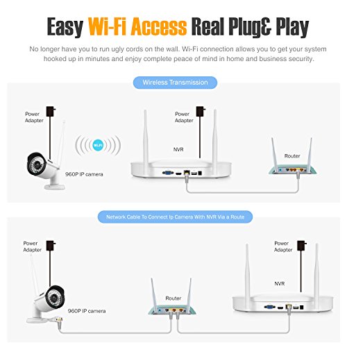 -. Feature : Advanced H.264 Video Compression, 1.30Megapixel 960P IP Cameras with smart IR, true day and night continuous protection / Cameras generate up to 66ft/20m black and white night vision in ambient lighting. Sleep assured every night knowing you have reliable infrared eyes to help you keep burglars at bay. / We engineer the DVR to support up to 1080P VGA and HDMI video output. Just connect your HD monitor or TV to it and enjoy the crisp and clear on-screen movements. / Built with sturdy IP66 weatherproof housings, cameras are durable enough to withstand fickle weather conditions in outdoor use. Stay confident that your cameras are with you all year round. / Note: The Wireless Security Camera System Doesn't Mean Using the System without Any Cables. Need to Connect Cameras&NVR with Power Adapters for Power Supply.