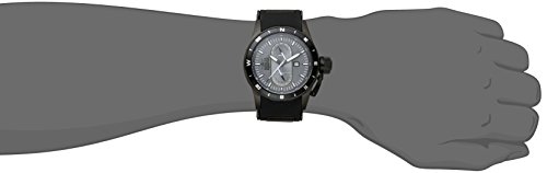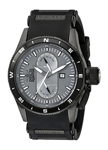 Grey dial with black and white hands and black hour markers; white second hand; luminous; black ion-plated stainless steel bezel with silver tone compass directions; secured screw-down protective cap on crown; invicta key chain included