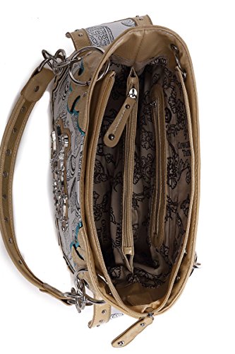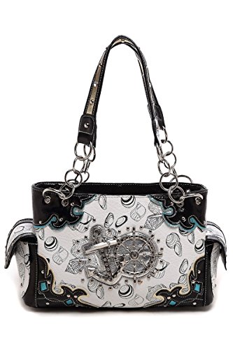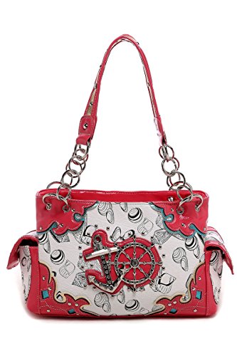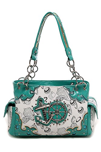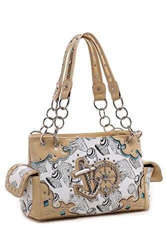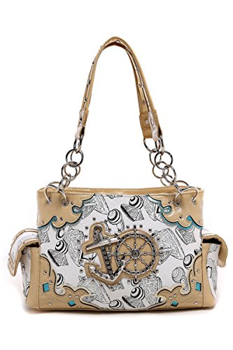 Product DescriptionBoat Wheel, Sea Shells Print Design And Studs Accented Satchel Bag H:8.5 L:12.75 W:4.5 Handle Length: 27 MATERIAL:PU Faux Leather 2 Side Pocket 1 Back Zippered Pocket and 1 Small Pocket 3 Inside Compartment and 2 Zippered Pocket Top Zippered Closure0