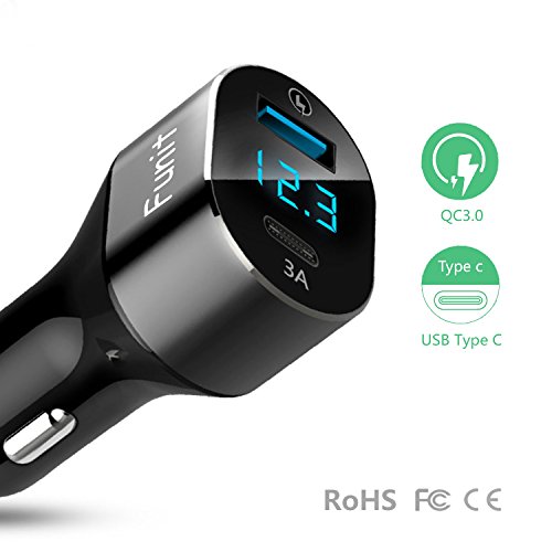 -. Feature : 【DUAL QUICK CAR CHARGER】: This QC 3.0 charger has two USB charge ports, QC 3.0 and type C ports. So you can charge 2 devices at the same time. QC 3.0 port provide 4 times faster than other ordinary car chargers. *Only when use it with the original charge cable that support QC 3.0 can get up to Max 3A Current / 【ADVANCED TECHNOLOGY SAFE CHARGING】: We apply High Quality Chipset 6601Q and environment friendly Materials of Fire Resistance ABS Coating, also design this car adaptor with OVERHEATING/OVERCURRENT/OVERCHARGING PROTECTIONS. So you can use it safely no worry / 【PRECISE VOLT NUMBER UNIQUE APPREARENCE】: The charger shows real-time volt data precisely. The Soft blue LED light looks pretty esp. at night. It is our P.R.Ivate model car charger which takes you a unique appearance / 【COMPATIBLE WITH MORE CABLES】: The car charger is with QC 3.0 and Type charge ports. So you can use it with the Type C to Lightning cable and USB cable / 【CERTIFICATION AND WARRANTY】: CE FCC ROHS Certified. FUNIT USB Car Charger provide 100% Satisfaction Warranty and 24/7 Customer Service. If you are not satisfied we promise full Money Back no reasons ask