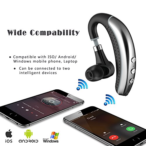 -. Feature : HIGH-QUALITY CALL AND STABLE TRANSMISSION: This bluetooth headset applied new bluetooth version 4.1, with functions of smart noise reduction, far transmission speed. It can provide high-quality stereo sound and stable calling. / WIDE COMPATIBILITY AND FAR CONNECTIVITY RANGE: This bluetooth headset can support ISO/ Android/ Windows phone, notebook, computer and other bluetooth devices. Also, it can connect with two bluetooth devices at the same time. The connectivity distance can cover 10 meters (33 feet). / FASHIONABLE AND ERGONOMIC APPEARANCE DESIGN: This bluetooth headset body was made of soft plastic, with definite elasticity comfortable for any ear size. And the freely-flex, rotating earphone was also available for left and right ears. Metal cover, gray line intersperse and the design of canceling traditional mic staff reveals fashion and high-quality features. / LIGHT-WEIGHT AND COMFORTABLE-WEARING: The weight of this bluetooth headset is only 12g because of reasonable material match and Ergonomic appearance design, which all make more stable and comfortable for wearing. / LONG BATTERY USE and VALUE-ADDED GIFT: It has powerful battery use, which can keep talking for 6.5h, playing music for 6h, and standby for 180h, but only charging for 1.5h. In addition, a premium ring buckle of drop shape was suitable for phone, pad, and tablets, and it will be free presented.
