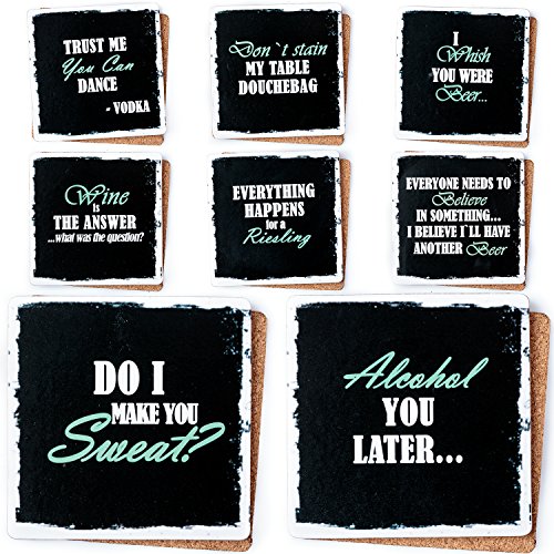 - ✔•WITTY ONE LINERS, STYLIZED DESIGN, OH MY! - Designed for both utility and fun, these bar coasters will not only keep your tables dry and unscratched, but also keep your friends excited, entertained, and happy! Each comes with a witty one liner, joke, or conversation starter your guests are going to go crazy over!
