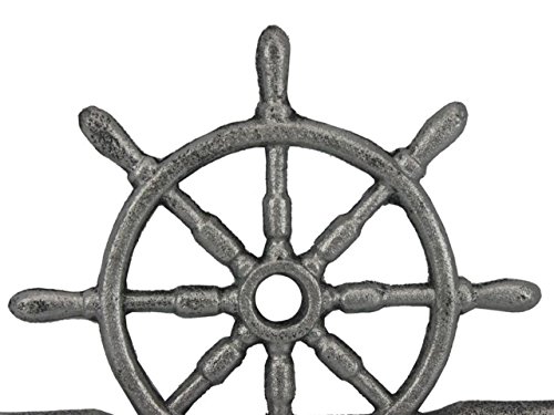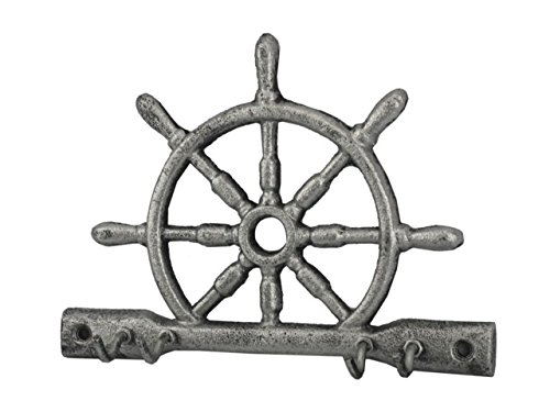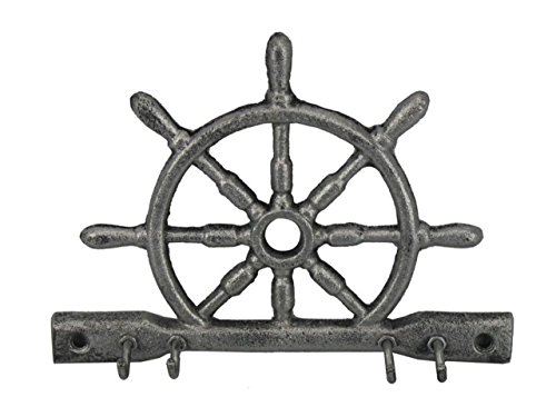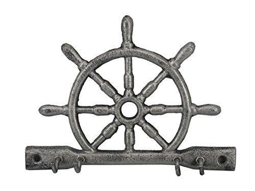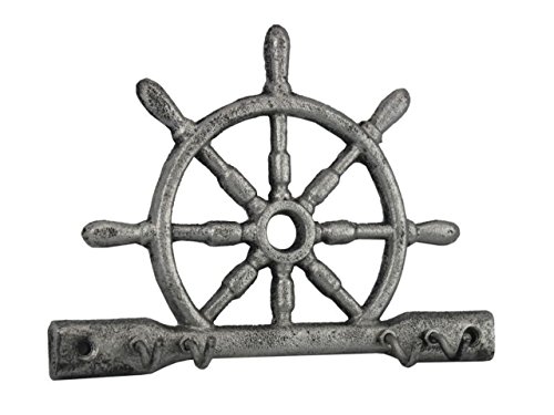 Hampton Nautical Rustic Silver Ship Wheel with Nautical Hook 8" - Decorative Cast Iron Wall Hook - Metal Wall Art