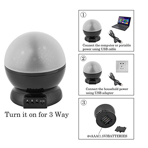 This baby star night light projector is very convenient to use, just powered by USB cable with DC adapter (not included) power bank and power source,also powered by 4 AAA batteries(not included)