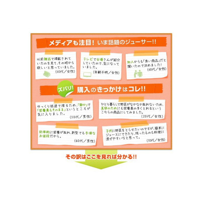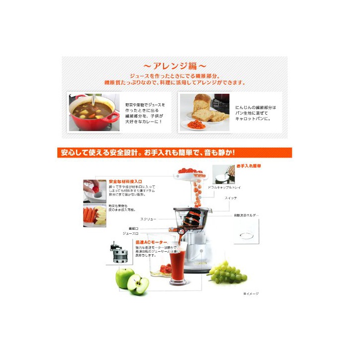 세트 내용:본체 세트(본체,고형 성분 받침 용기,드럼 캡,쟁반,추진기(screw),쥬스 strainer,strainer 자동 세정 홀더,패킹부 드럼,두부용형,착즙용받는 것 용기,누르기 판,청소 브러시,누르기봉)고, 취급 설명서,아이디어 북