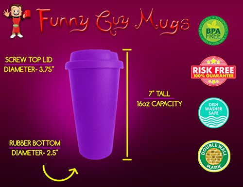 CONTENTS: * 1 BPA Free Plastic Travel Tumbler * Contents Come New In A Color Gift Box. MATERIAL: * Rubber Bottom * Plastic Screw Top Lid * Double Wall Plastic Body * Double Wall Plastic Body * Plastic Tumbler= Double Wall Body, BPA Free Plastic, Rubber Bottom, Screw Top Lid & Machine Washable. SIZING: Tumbler= Approx 7" Tall- 2.5" Diameter Base- 3.5" Top Fits In Most Cup Holders. Perfect For The Car, SUV, Van Or Truck. Comfortable Grip That Provides Convenient One-Handed Drinking For Both Left and Right Handed Users. Ideal For Coffee, Tea And Hot Cocoa. Perfect For In The Office Or On The Go. ABOUT FUNNY GUY MUGS: This Tumbler Was Created Exclusively By Funny Guy Mugs. Funny Guy Mugs Is A Trusted Company Ran & Founded By Brothers Whose Mission Is To Create High Quality Products That Put A Smile On Your Face!