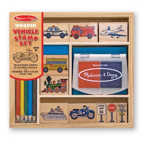 Go wherever your imagination takes you! It's easy to mix and match these detailed vehicle and traffic sign stamps to create hundreds of visual adventures. All the pieces, including the 2-color inkpad, store in a sturdy wooden box. Washable, kid-friendly ink.