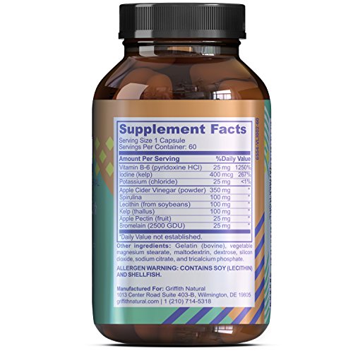 -. Binding : Health and Beauty -. Brand : Griffith Naturals -. EAN : 0806810457832 -. Feature : WEIGHT LOSS + METABOLISM PURE APPLE CIDER - stimulate metabolic rate with enzyme + mineral stack - suppress appetite with 25 mg pectin keeps you full - 400 mcg Iodine balances hormones in thyroid / STACKED ENERGY COMPLEX - Potent combination of superfood Apple Cider Vinegar Superfood with other fat burning vitamins + minerals like B6 - raise metabolism the organic way + convert carbs to fuel / COMBINE WITH MEALS - Apple Cider Vinegar reduces blood sugar + glucose after eating food - Take three times a day - stimulate enzymatic activity + regulate protein synthesis - try with honey / BETTER TASTING - Tablets easier to take than liquid - no strong taste or aftertaste but maximum benefit - better for tooth enamel - lose fat stores + weight - fast easy addition to healthy lifestyle / IMMUNITY + DIGESTION - support lymphatic system + immunity - flush fat faster through tract + stimulate digestion while you cut cravings for salt + sugar with this all day vinegar fat burner -. IsAdultProduct : 0 -. Label : Griffith Naturals -. Manufacturer : Griffith Naturals -. MPN : LE -. PackageQuantity : 1 -. PartNumber : LE -. ProductGroup : Health and Beauty -. ProductTypeName : HEALTH_PERSONAL_CARE -. Publisher : Griffith Naturals -. Studio : Griffith Naturals -. Title : Apple Cider Vinegar - Weight Loss + Detox Supplement Capsules - Natural Benefits for Digestive system - Health - Metabolism - Increase + Improve Energy + Skin + Immunity - Griffith Naturals -. UPC : 806810457832
