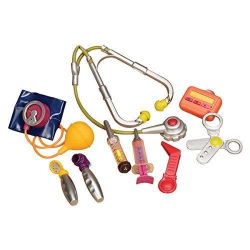 Studio : Battat Publisher : Battat Binding : Toy Product Description B. Dr. Doctor The doctor is in with our B. Dr. Doctor kit. Features 9 doctor tools that fit right inside the case with easy carry handle. Includes stethoscope with sound, beeper with light and sound, otoscope (ear checker), blood pressure cuff, ouch less tweezers, say "Ah!" mirror, safe syringe, just-as-safe scissors and thermometer. 2-AAA batteries required-not included. Ages 18 months to 5 years.