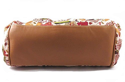 -. Feature : Material: Polyester, soft man made leather trim and handles. / Measurement: Approximately 15.00" W (widest area, east west) x 9.00" T (north south) x 6.00" D (side). Strap: 9.50" drop. / Outside: 1 large zipper pocket on the front. 1 pocket on each side for cell phones and keys. Top zipper closure. / Inside: Triple sections. Zipper pocket inside the middle section. Imported. / Placement of pattern is different and unique on each purse. Front zipper pull is green/pink, logo plate is pink/silver, fabric zipper pulls are pink.
