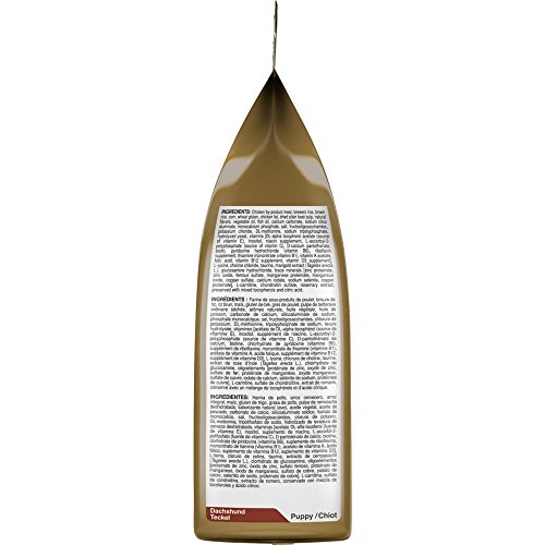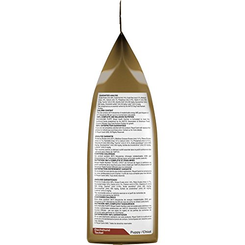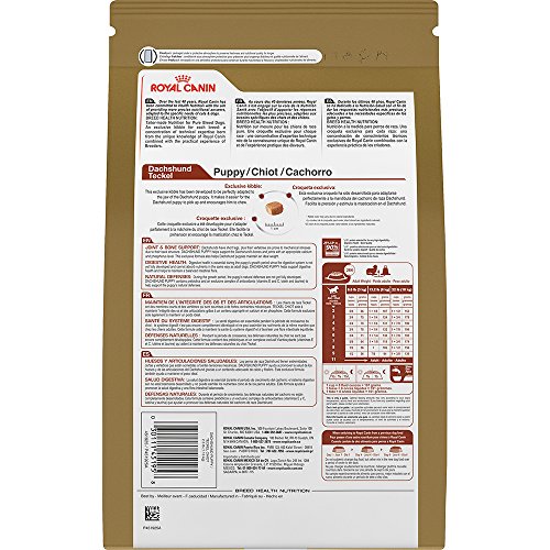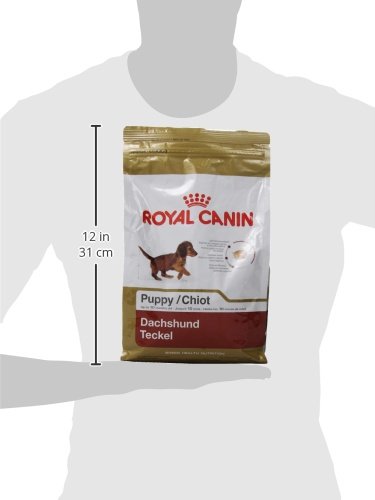 Royal Canin Dachshund Puppy Food features an exclusive kibble developed to be perfectly adapted to the jaw of the Dachshund puppy. It makes it easier for the Dachshund puppy to pick up and encourages him to chew. Dachshunds have short legs, plus their vertebrae are prone to mechanical stresses due to their back structure. Dachshund Puppy helps support the Dachshund's bones and joints with an appropriate calcium and phosphorus level. This exclusive formula helps Dachshund puppies maintain an ideal weight. Digestive health is essential during the puppy's growth period since the digestive system is not yet fully developed and cannot absorb nutrients in the same way as adult dogs. Dachshund Puppy helps support digestive health and helps to maintain a balanced intestinal flora. During the growth period, the puppy's natural defenses are not yet fully developed. Dachshund Puppy contains prebiotics and an exclusive complex of antioxidants (vitamins E and C, lutein and taurine) to help support the puppy's natural defenses. 100% complete and balanced nutrition. Recommended for pure breed Dachshunds from 8 weeks to 10 months old. Size: 2.5 pounds.Feature