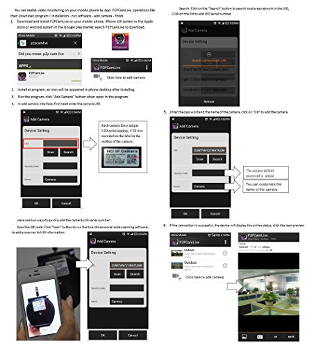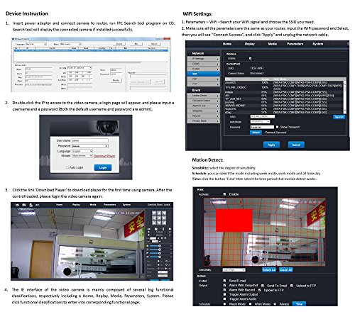 -. Feature : 1.0 Megapixel 1/4" Sensor, 720P HD (1280*720). Support 32G TF microSD card for recording and playback / Audio In/Out, Support external MIC and Speaker. Alarm In/Out, one channel audio input, one channel audio output / Motion Detection automatically detect moving objects and send alarm to email, Send push notifications alerts / Plug&Play, QR code scanning to view. Easy one key WiFi configuration. Night Vision distance up to 50 feet(15m) / Free App P2PCamLive for iOS iPhone and Android smartphone/tablet, Outdoor/Indoor use, waterproof IP66