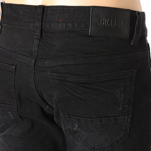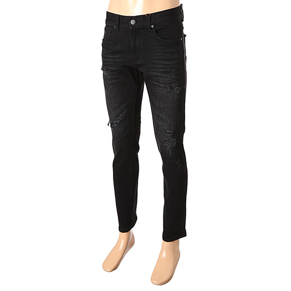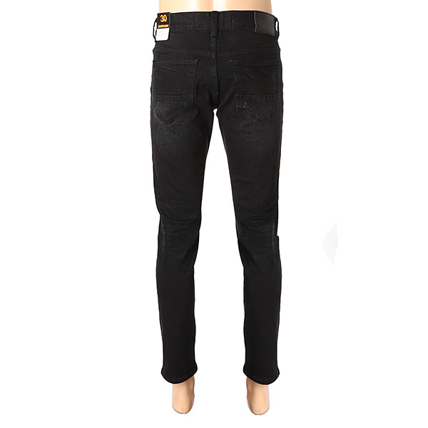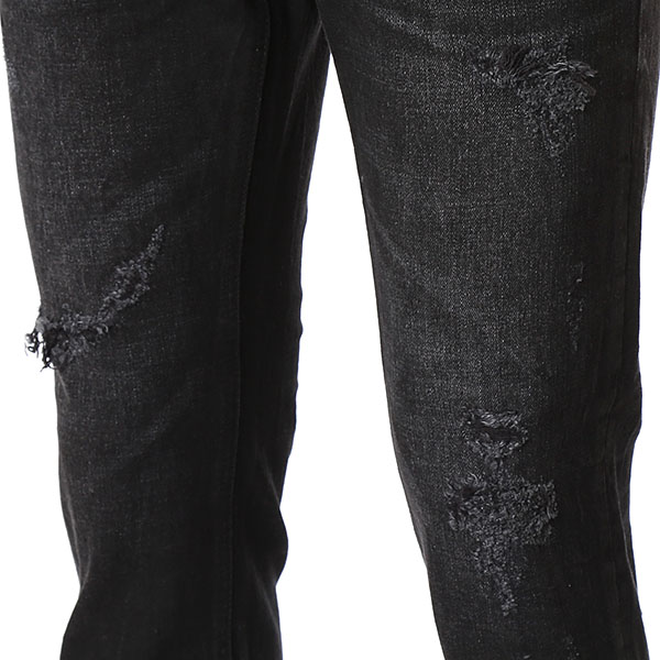 블랙 칼라 캣엠보 시와 워싱에 과감한 라텍스 구제와 누빔 스티치로 포인트를 준 남성용 TA핏 데님 스타일.