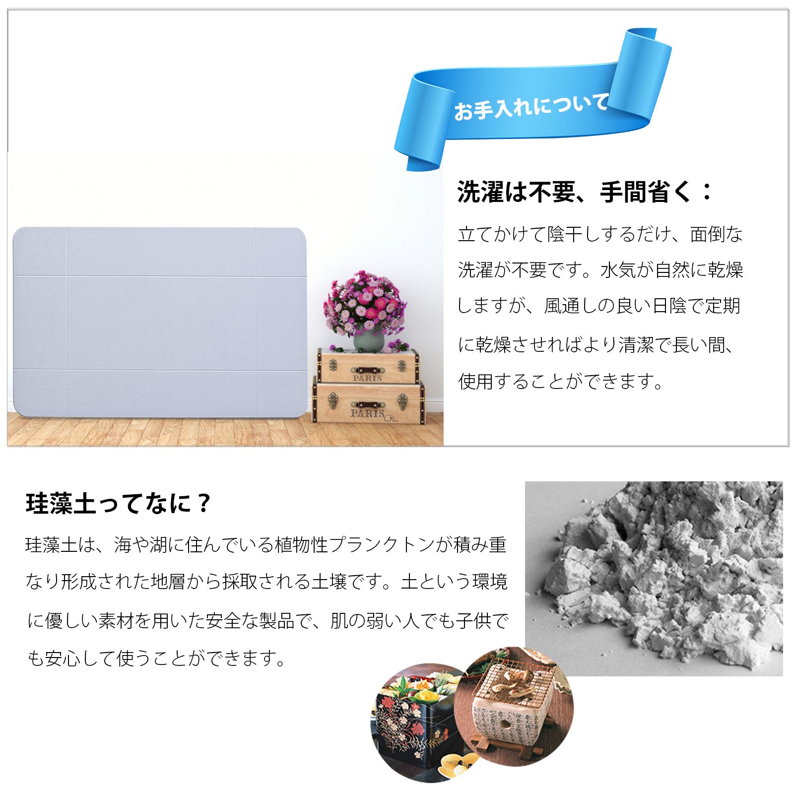 What I would like to recommend to everyone this time is diatomaceous earth bath mat that will solve the problem.