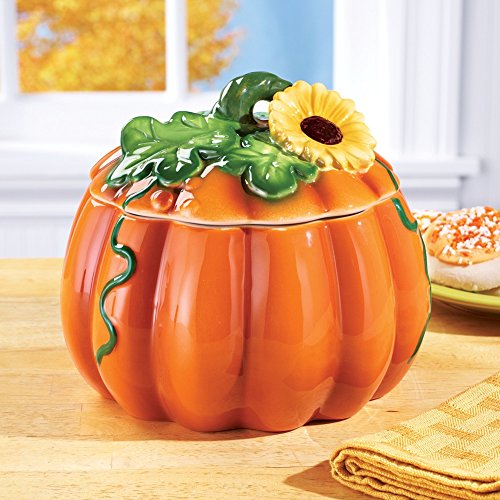 Studio : Collections Etc Publisher : Collections Etc Product Description Harvest Pumpkin And Sunflower Cookie Jar Hand Painted Description Store your sweet treats inside this charming pumpkin cookie jar. The hand-painted pumpkin features green leaves, vines and a bright yellow sunflower. Hand wash. Dolomite. 7 1/2"Dia. x 6 1/2"H. Shop Coordinating Items [ TIP: Type the product name and item # into the search box ] - Pumpkin 3-Tier Glass Serving Tray Buffet (Item #39514)