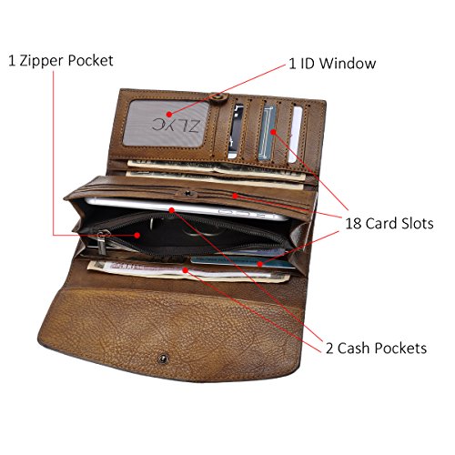 With 18 card slots, 1 ID window, 2 cash pockets, 1 zippered pocket, 4 other full length pocket for receipt, notes, etc. Useful and keep your money and your cellphone safe!